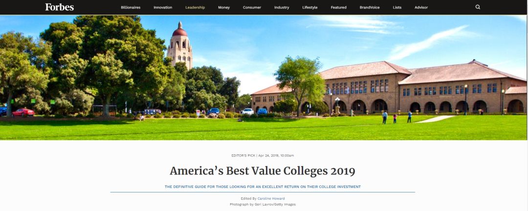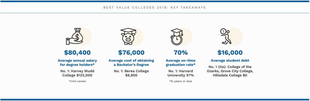 据研究,近些年来美国大学的经济成本暴增——平均每个借贷人负债28,650美元,累计1.5万亿美元。再加上最近的大学招生作弊丑闻,这一系列现象都表明,大学的门槛似乎越来越高了…为了更好地服务学生,为了让更多的家庭在这次重大投资中获得良好的回报,在5月1日大学签约日——大多数大学生接受录取的截止日期到来之前,福布斯公布了2019年价值的美国大学排名。参与排名的645所学校均为四年制学位的公立和私立大学,不包括私立盈利性学校。