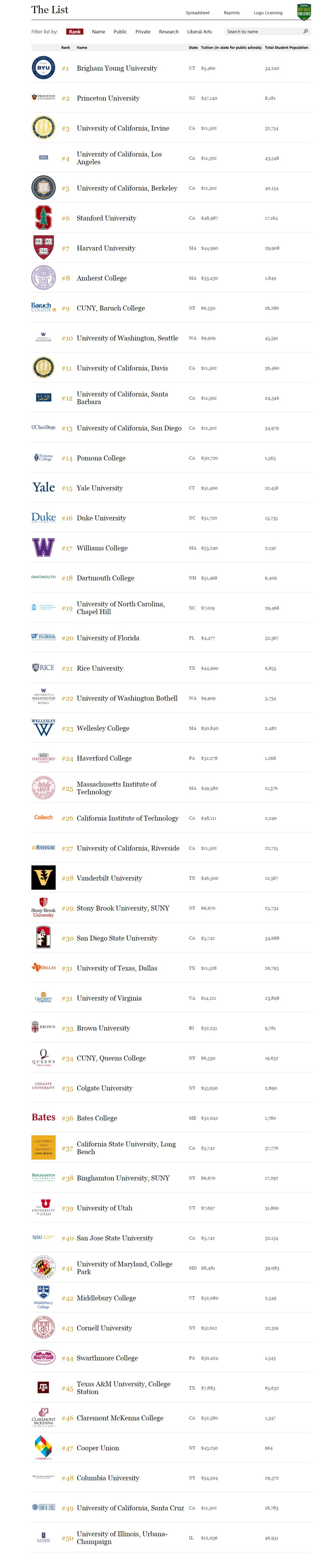 最近的美国大学排名,即2018年福布斯大学排名;