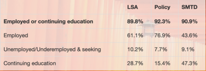 下图是文理学院(LSA)、公共政策学院(Policy)和音乐、舞蹈、戏剧学院(SMTD)的毕业走向情况。