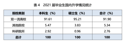 如上图:就升学来说,本科生选择国内深造中的绝大多数——91.61%是进入了双高校。硕士生深造进入双高校的比例更高,达到了95.21%。