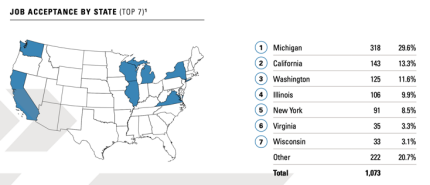 密歇根安娜堡的工科毕业生主要前往:是学校所在的密歇根州,然后是加州、华盛顿州、伊利诺伊州和纽约州。
