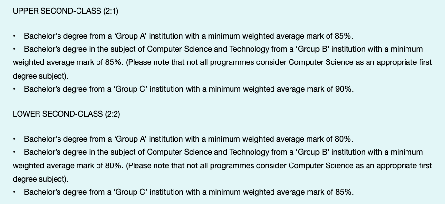 (在这一条要求中UCL并未明确规定除计算专业外其余专业录取成绩要求,据推测将以C类成绩做参考)