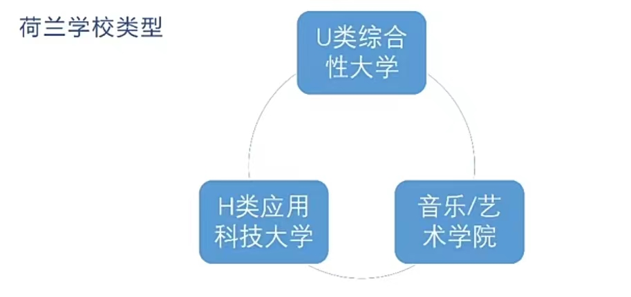 荷兰学校主要分为三类:U类综合性大学、H类应用科技大学、音乐/艺术学院。