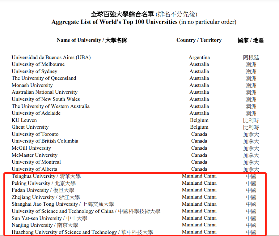 需要注意的是,全球百强大学列表包括在最近五年曾于四个指定全球大学排行榜任何一个中位列百强的大学。