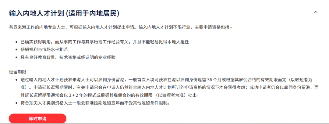 1. 输入内地人才计划:“输入内地人才计划”也就是“专才计划”,目前属于「人才清单」表列的13项本地人才短缺专业的申请人,只要符合相关工种及一般职责要求等,便不需再进行市场供应测试,可受聘来港。