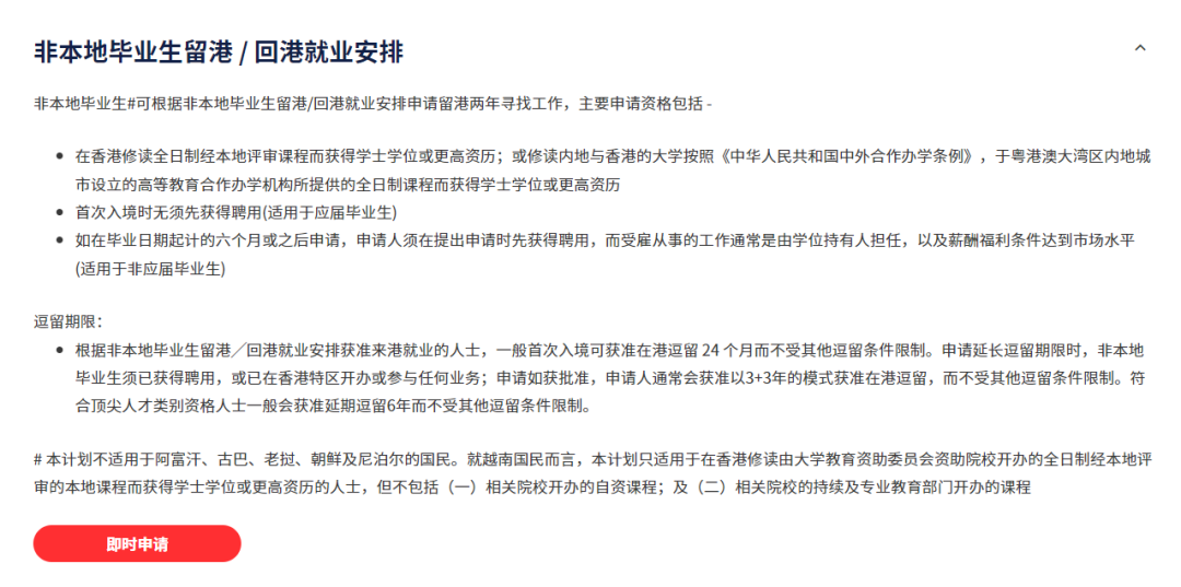 3.非本地毕业生留港/回港就业安排:在香港修读全日制经本地评审课程而获得学士学位或更高资历,留学期间即可申请学生签证在港居留,毕业后可申请2年的香港IANG签证,续签满7年即可申请香港永居。