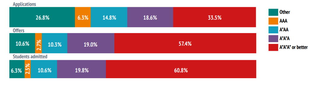 而根据录取数据看,在2022年有66.9%递交申请的学生与接近91.2%的最终录取学生成绩都在A*AA及以上,其中多达60.8%的学生成绩在3个A*及以上。