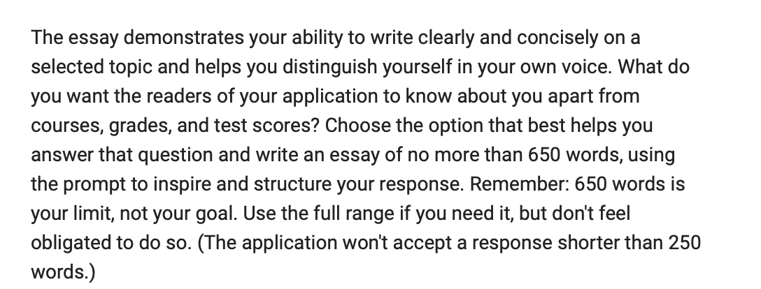 文书明确要求写得清楚和简洁(write clearly and concisely)。如何解读?文书的内容,包括结构、文体等,都没有限制,而且我们过去确实看到过一些文书的范例,包含大学的,有过比如用高深的英文诗形式来写的文书。但对于大多数中国申请者来说,可能写得清楚和简洁是一个更好的选择。如果写好之后,让熟悉你的老师或者升学指导阅读,理解起来很费劲,那么可能就要考虑如何修改一下,毕竟招生官每年要读大量的申请材料。