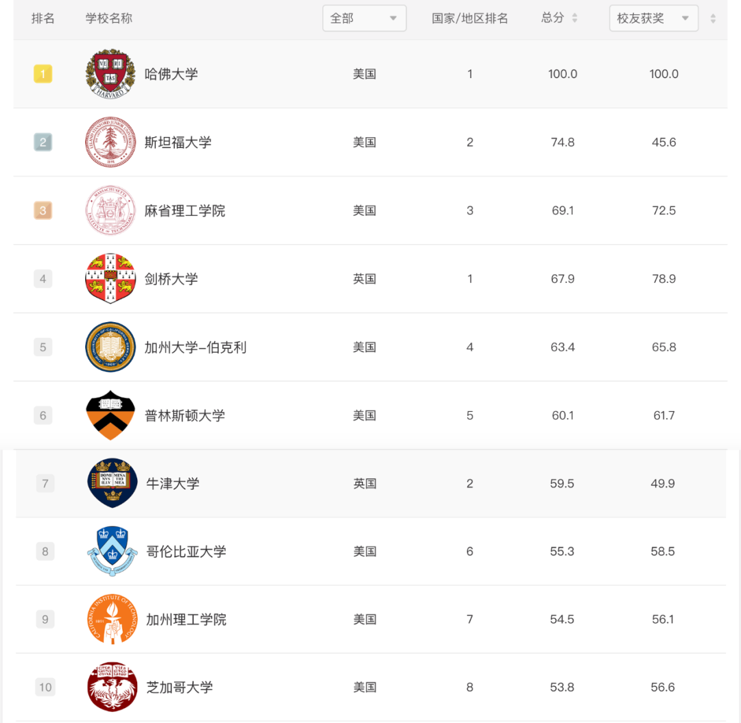TOP10院校,名次并未调整。其中美国大学独占8所,TOP100中,美国院校共上榜38所,占据绝对地位!