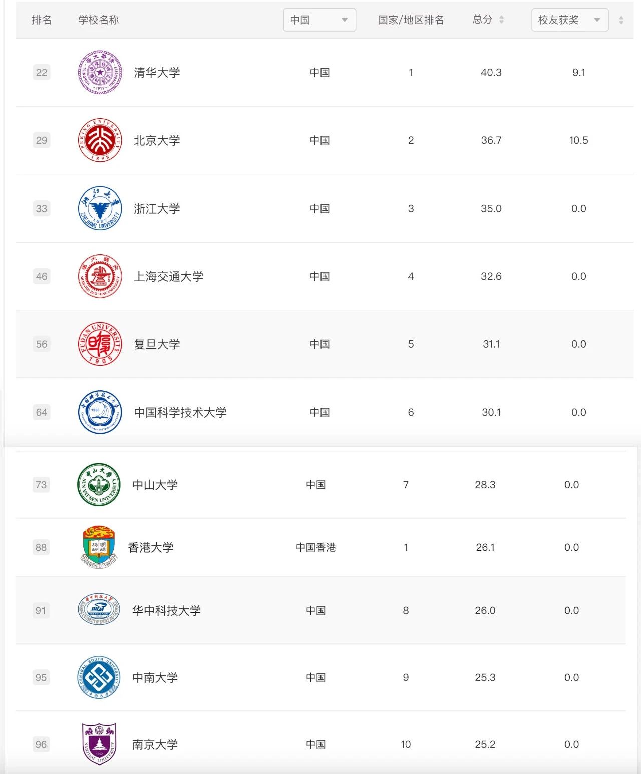 中国内地共有191所大学上榜,其中10所位列世界百强,比去年增加2所: