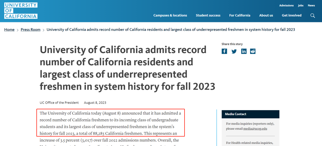 在报道中,学校表示23fall本科新生的州内录取人数创下了历史新高!共有88,285名加州新生,和22fall的州内录取人数相比,增加了3.5%。