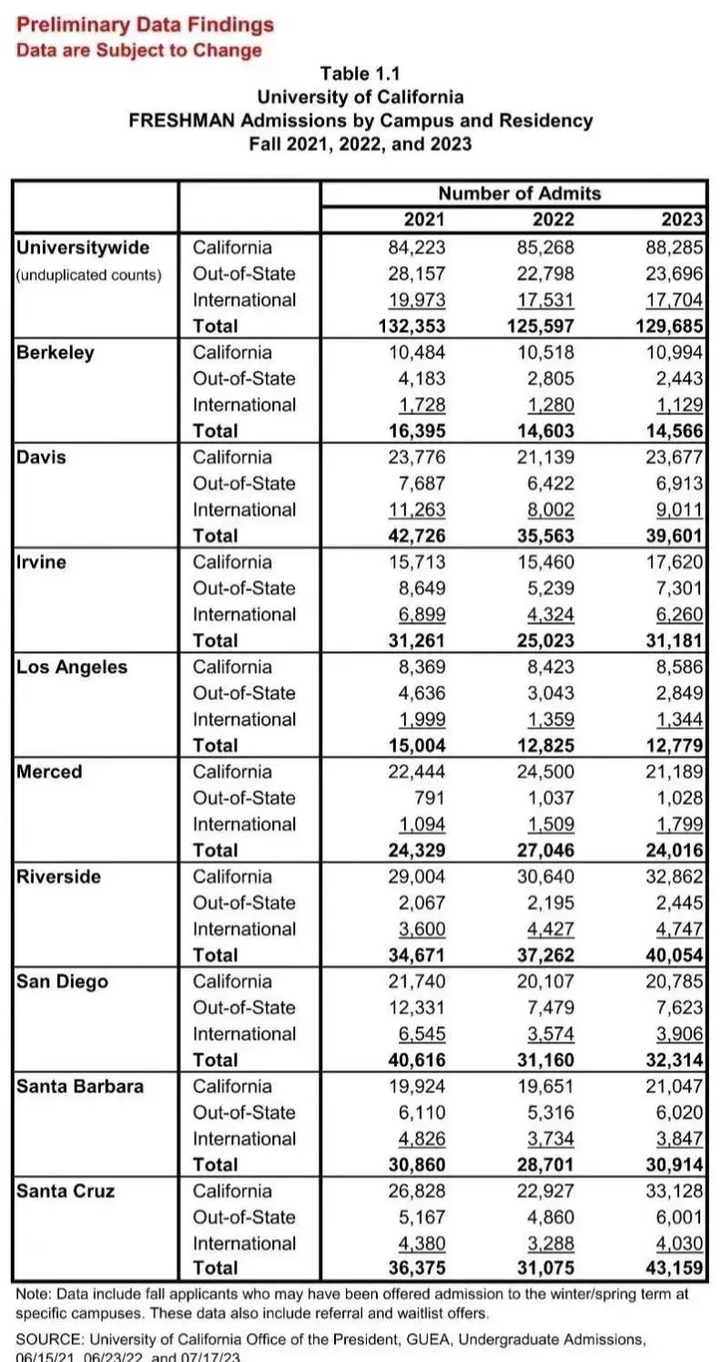 经过激烈的竞争后,23fall九所分校的新生总录取人数为129,685人,与22fall相比增加了3.3%,加州州内、州外和国际生的录取人数均有上升。