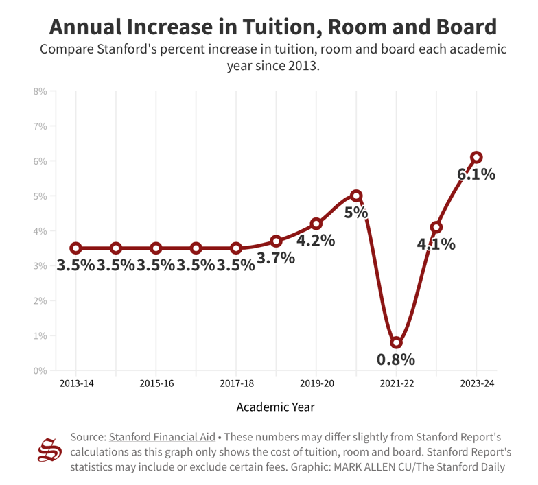 下图为斯坦福从2013年以来,学费加食宿费用每年的增速。