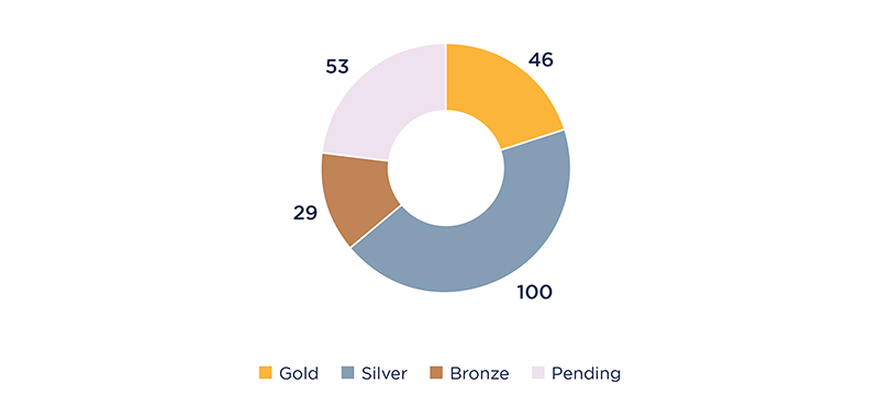今年,总评级为金奖、银奖、铜奖的机构分别为46所、100所和29所。