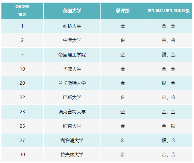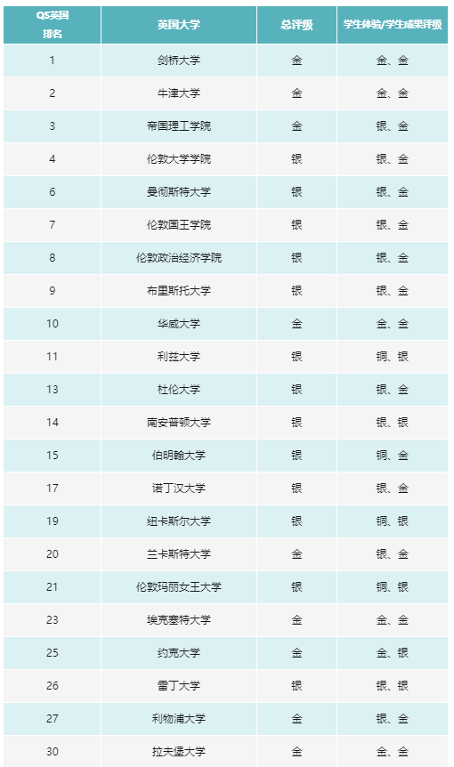 学生体验评级为金奖的英国TOP30大学:牛津大学、剑桥大学、华威大学、巴斯大学、埃克塞特大学、约克大学、拉夫堡大学。