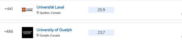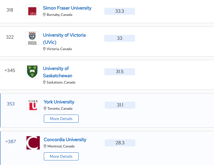 此外,入围世界前500位的加拿大大学还有:渥太华大学、女王大学、达尔豪斯大学、西蒙菲莎大学、维多利亚大学、萨斯喀彻温大学、约克大学、康考迪亚大学、拉瓦尔大学、圭尔夫大学。