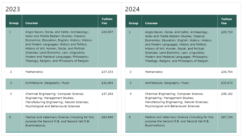 2024/25学年,剑桥按照各类专业性质,将国际生学费分为五组,其中学费最低的是人文社科类专业,最高则为医科类专业。各学科费用分别是: