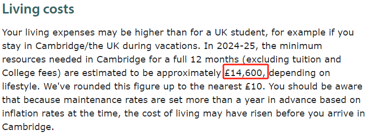 2024/25学年,剑桥大学一年所需的最低生活费估计约为£14,600(上一年预算£12,400)。当然了,具体还要取决于每个学生的生活方式。