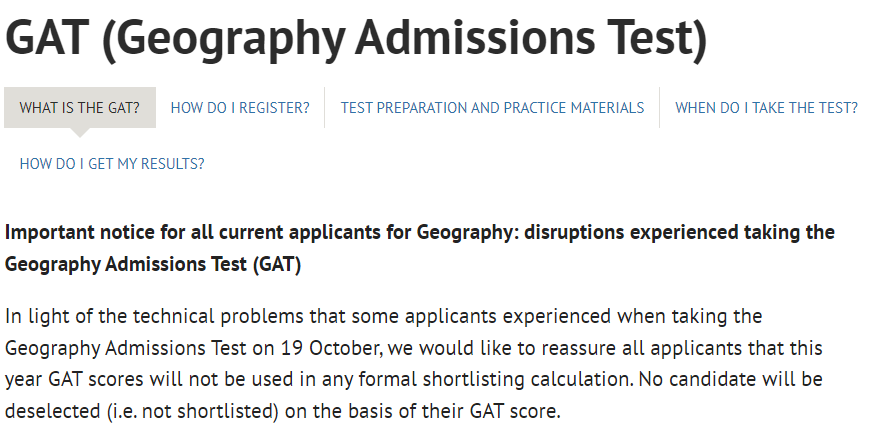 “鉴于部分申请人在10月19日参加GAT时遇到了系统故障,我们向所有申请人保证,今年的GAT成绩不会用于任何录取评估。不会有申请人因其GAT分数而落选(即未入围面试)。”