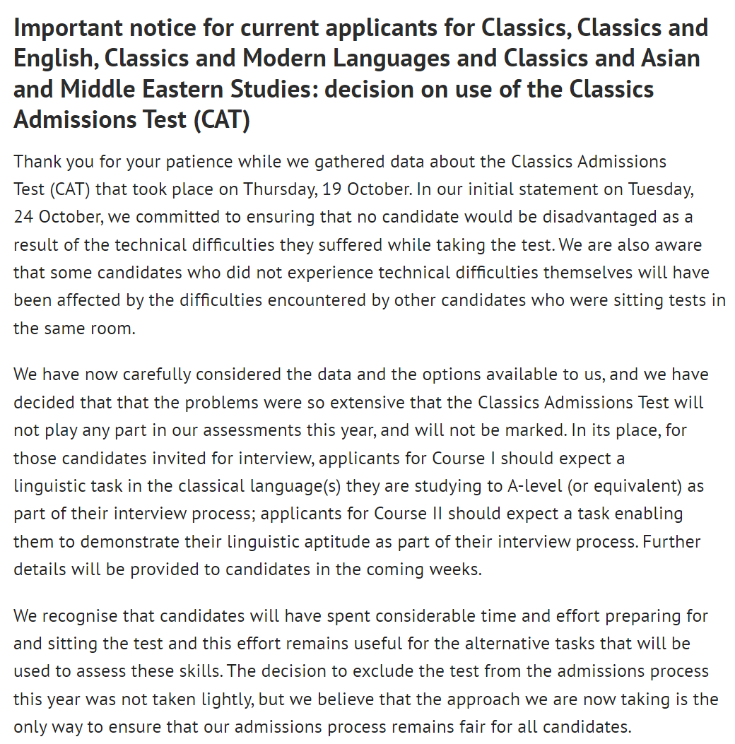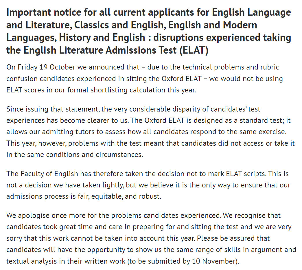 “10月19日星期五,ELAT官方宣布,由于参加牛津大学ELAT考试的考生遇到技术问题和题目混淆,今年将不会在正式的面试候选名单计算中使用ELAT成绩。