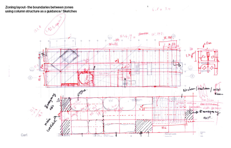 除了对 Bürolandschaft 设计理念的调研之外,Nguyen 的作品集中还添加了许多时间轴、设计迭代和过程中的sketch;