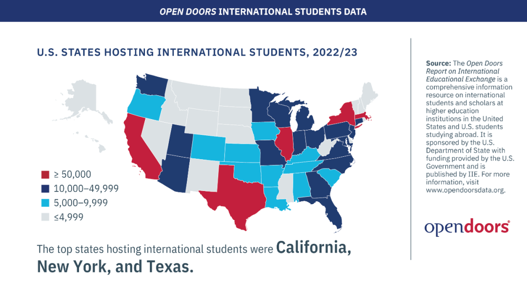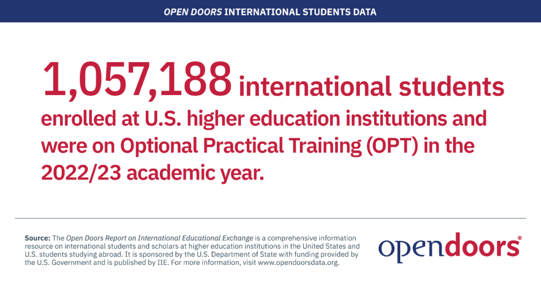 根据最新的数据显示,在2022-23学年美国的国际生人数为1,057,188人(包括在读生和OPT阶段学生)。