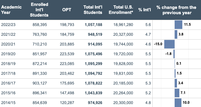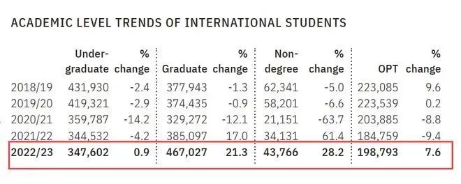 和去年相比,国际学生人数增加了11.5%,超过了疫情前的2019-2020年水平。