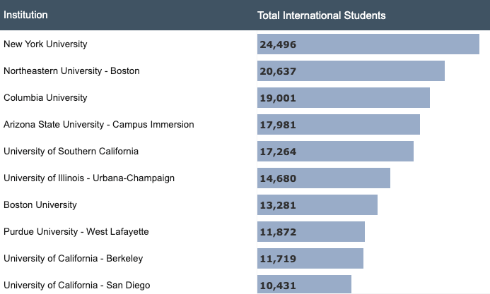 纽约大学再次拔得头筹,连续第九年国际学生人数排名,东北大学仍然紧随其后,是国际生人数第二多的高校。