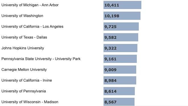 前十名还有:哥伦比亚大学、亚利桑那州立大学、南加州大学、伊利诺伊大学香槟分校、波士顿大学、普渡大学西拉法叶分校、加州大学伯克利分校和加州大学圣地亚哥分校。