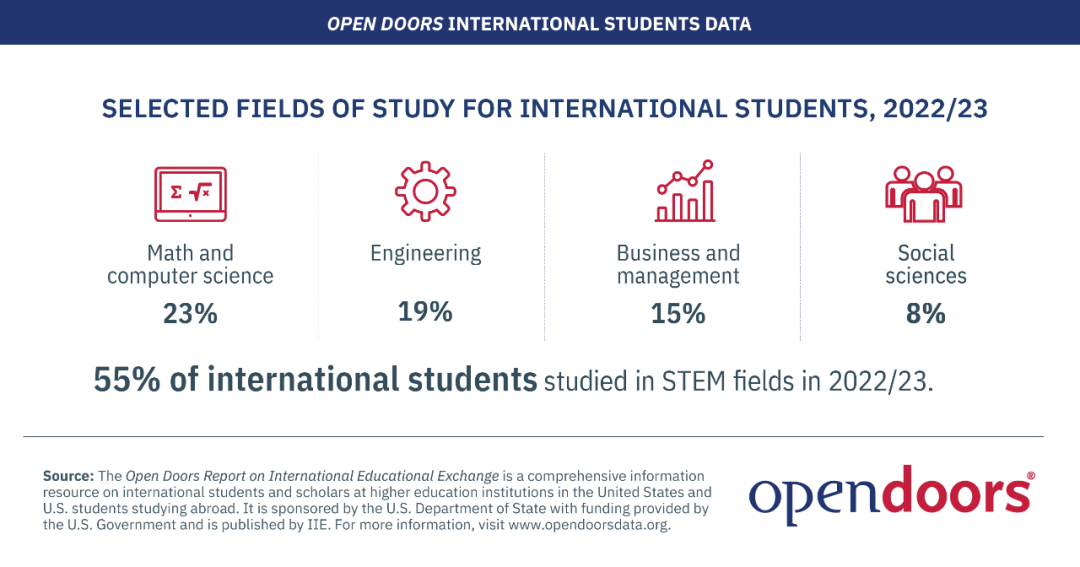 在2022/2023年,美国超过一半(55%)的国际学生修读了STEM研究领域的专业。STEM专业的人数占比高居不下,也是全球高等教育发展的大势所趋。