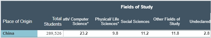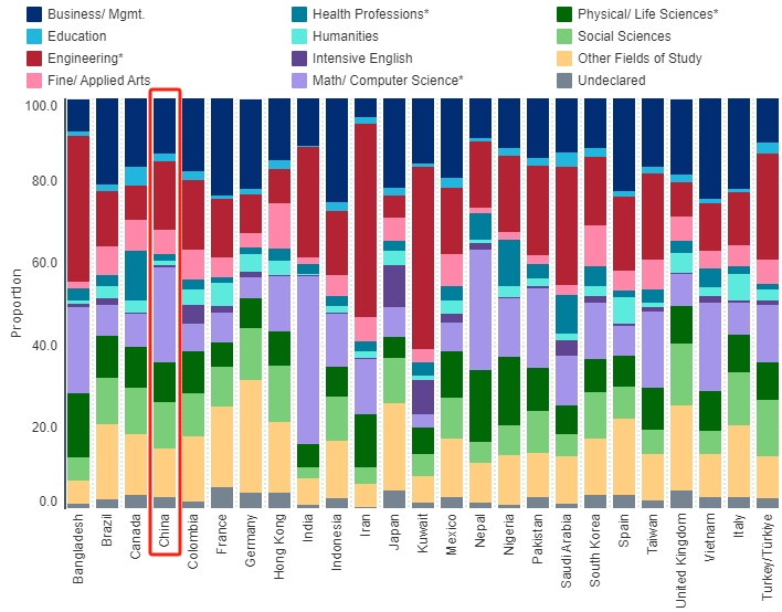 对于中国学生来说,今年数学及计算机专业人数继续保持,占总人数的23.2%,其次是工程(占比16.8%),商科(占比13.4%),社会科学(占比11.2%),物理和生命科学(9.8%)。