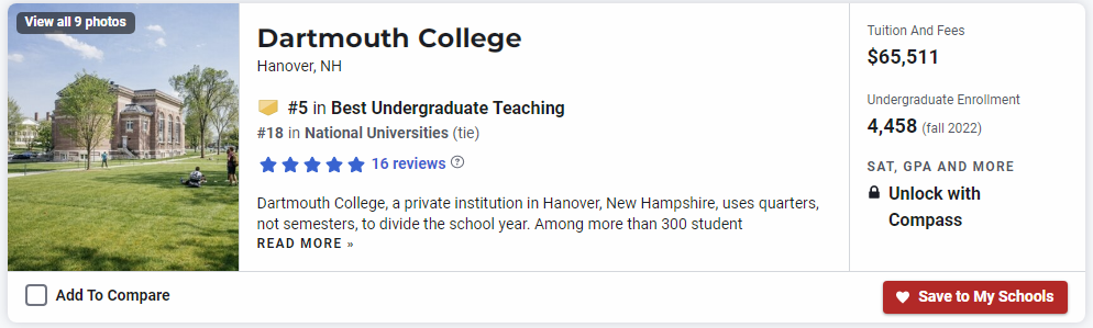达特茅斯学院虽然贵为常春藤盟校,但名字乍听之下有点像文理学院。为了突出学校对本科教育的重视,达茅一直以“学院”名世,提倡高质量的小班教学。