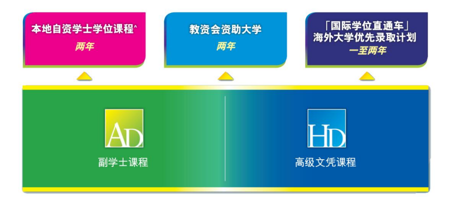 副学士毕业生可选择香港公费资助的高年级学士学位课程和自资衔接学位课程,港大、港中大、港科大、港理工、港城市、港浸会、港教大、岭南均设有相应的申请名额。