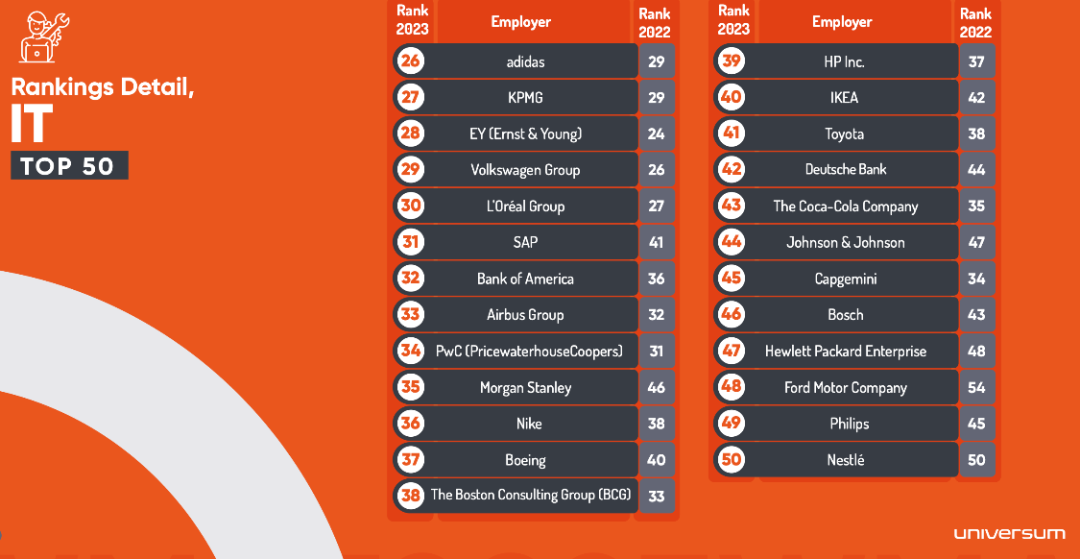 当然,最受IT类学生欢迎的职场50强名单中,德勤、毕马威、安永、普华永道也上榜,依次为第14名、第27名、第28名和第34名。