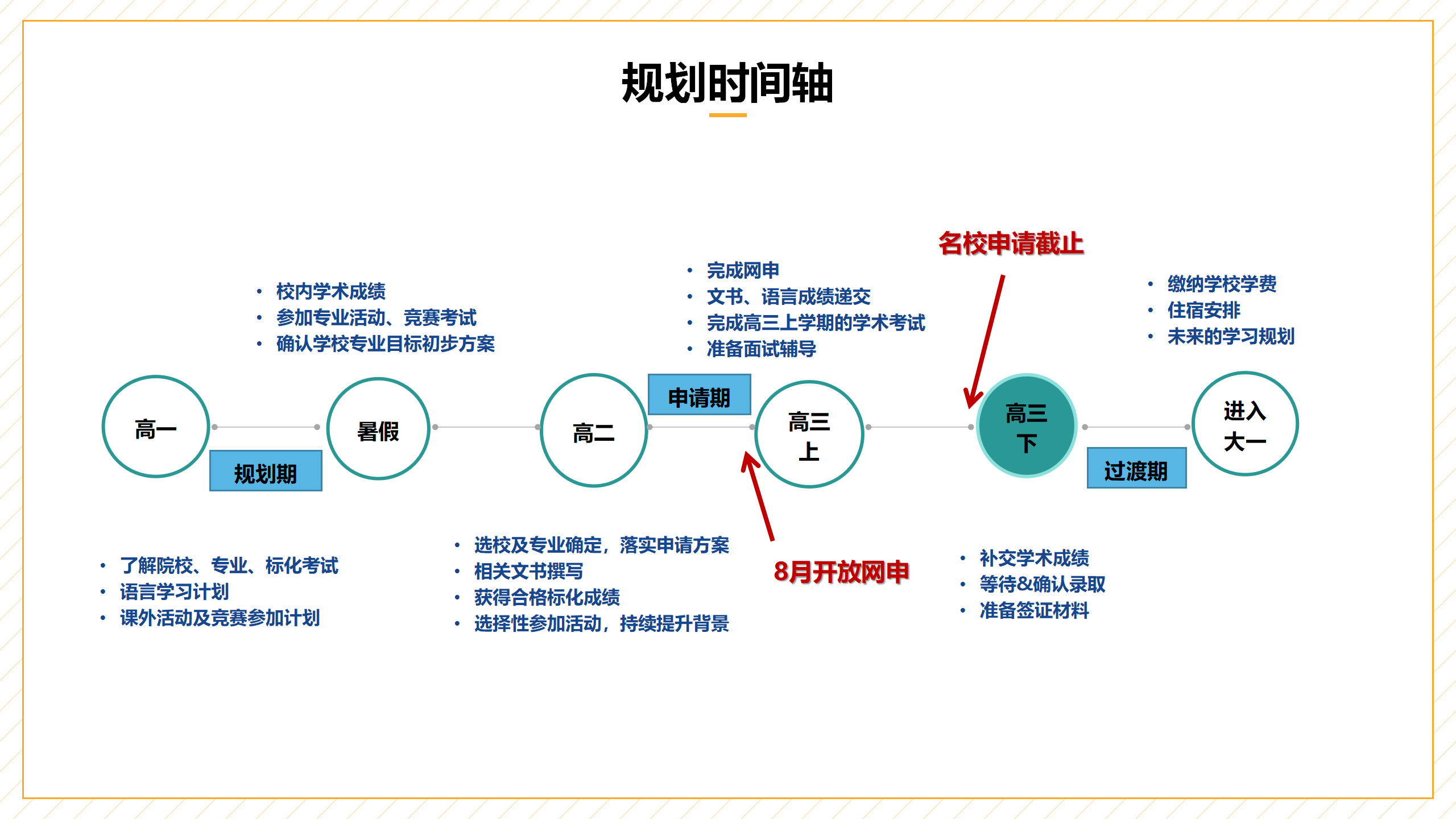 在高二末/高三初这个关键时期,学生需要着手提交网申,抓住早申的机会。同时,密切关注学校放榜的时间,提前做好签证等准备工作,为顺利的申请流程奠定基础。