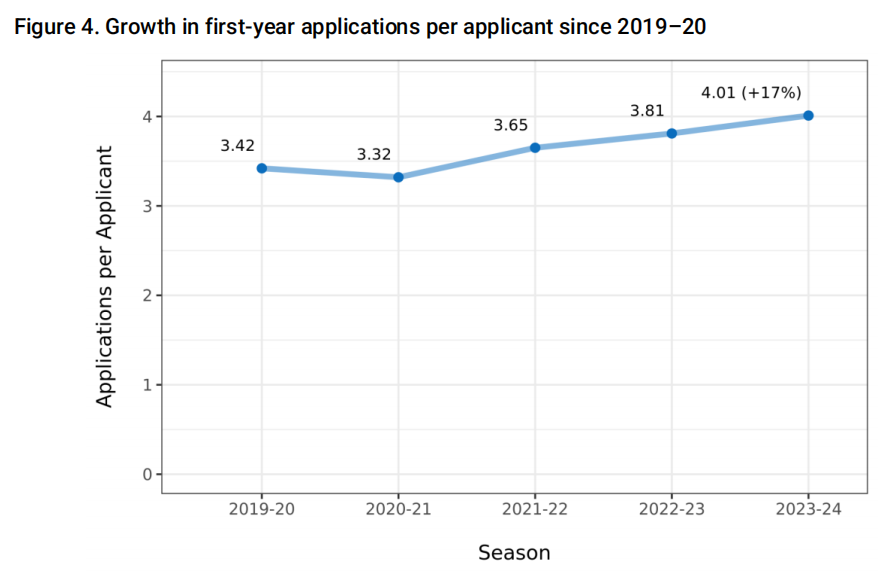 2023-2024申请季,年注册CA账户的人数、实际提交美本早申的人数、美国大学的申请总量、人均申请美国大学的数量等继续涨。