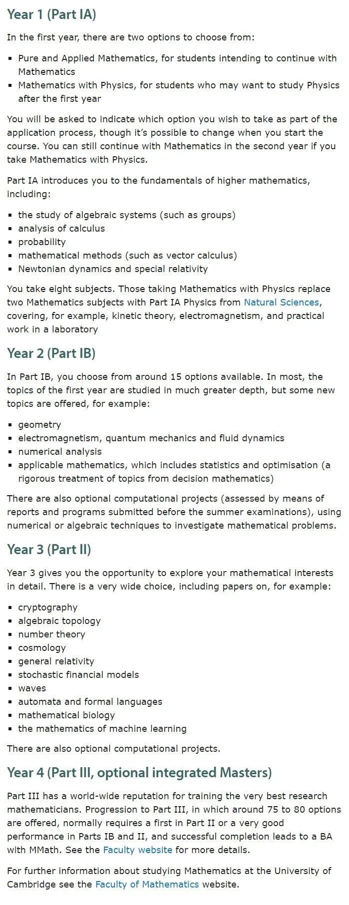 剑桥数学类专业的学制为3~4年,具体可分为三年制BA (Hons) Mathematics和四年制MMath Mathematics。主要分为两个方向: