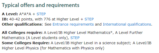 可以看到牛剑数学专业的入学要求两校都是A*A*A,但根据经验只有3门成绩,拒面试的可能性非常大,保险起见大家还是争取考到4A*以上吧。