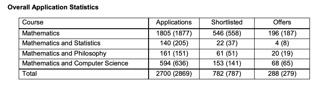 根据牛津大学发布的数据报告,22-23申请季整个牛津数学系共收到2700份申请(包括1000名非欧盟海外申请者),782人入围面试,最后发放了288枚Offer,Offer率约为10.7%,相比上一轮申请季的2869人申请、279人录取,offer率略有上涨,但整体竞争压力还是非常大。