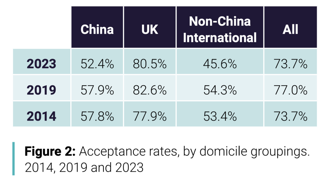 新的UCAS周期结束数据显示,2023年中国学生申请人数自2014年以来首次下降,从2022年的33660人下降到33195人(下降1%),而录取人数从去年的18500人下降到17400人(下降6%),这是自2015年以来的首次下降。