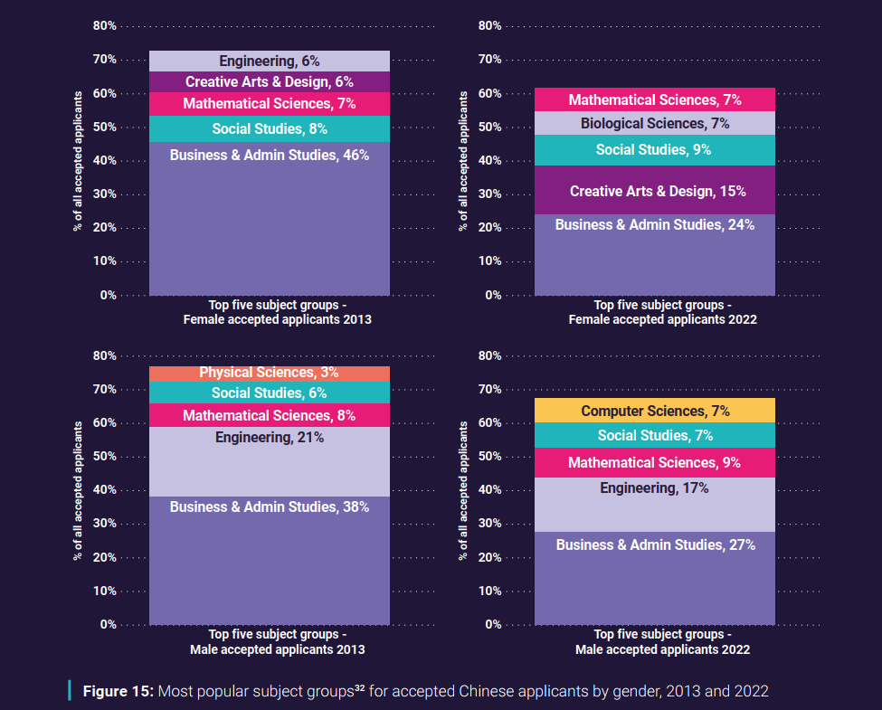 在过去的十年中,商科一直位居榜首,在2023年的录取中占26%,比2013年的43%有所下降。与此同时,学生们对创意艺术与设计专业的兴趣增加了一倍多,从2013年的4%上升到今年的11%,成为第四大最受欢迎的专业。