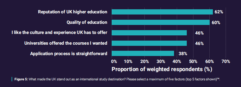 声誉(62%)、教育质量(60%)和文化体验(46%)是中国学生选择英国留学的主要原因。
