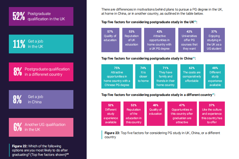 在英国攻读本科学位的中国学生中,近四分之三正在考虑在英国攻读研究生学位。43%的学生偏向于在英国找工作,34%的学生或回国发展。
