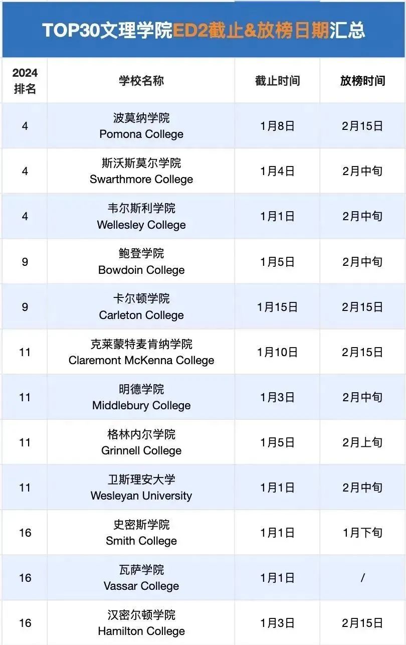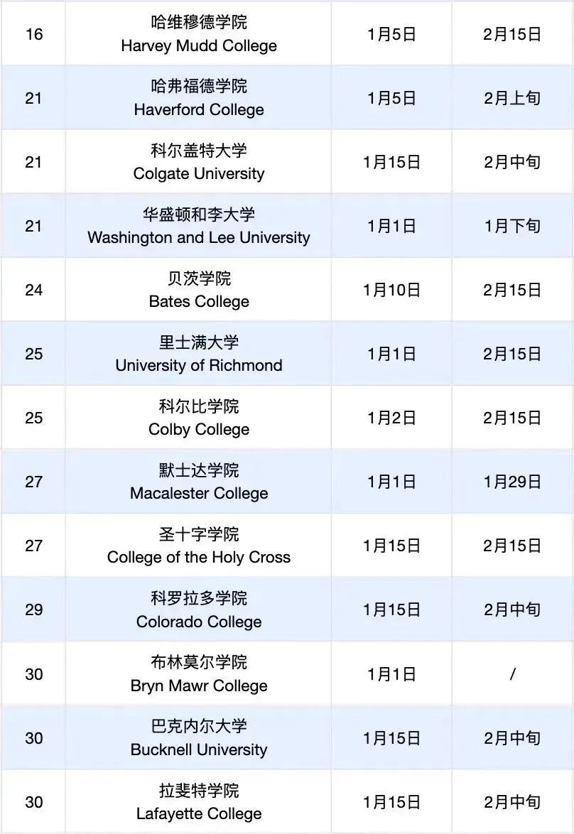 另外在前30的文理学院里,除了威廉姆斯学院和阿默斯特学院不提供ED2之外,其它几乎全都有ED2批次。