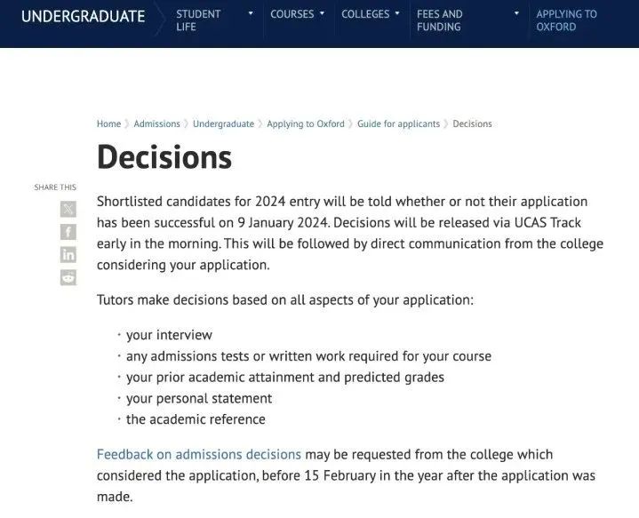 牛津大学将于2024年1月9日(比去年提前一天)向参加面试的学生发送录取结果。