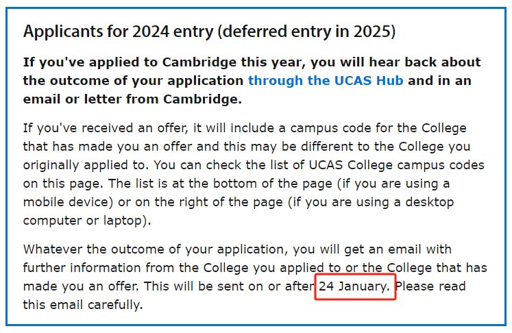 最近剑桥在给2024Fall申请者信息的页面进行了明确:如果今年申请了剑桥大学,将通过UCAS中心和剑桥大学的电子邮件或信件收到申请结果的通知。