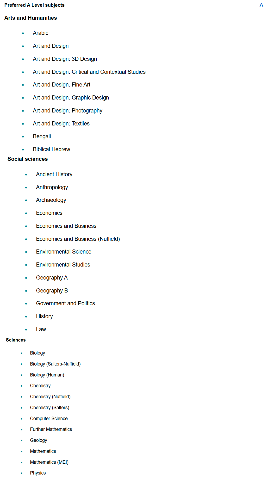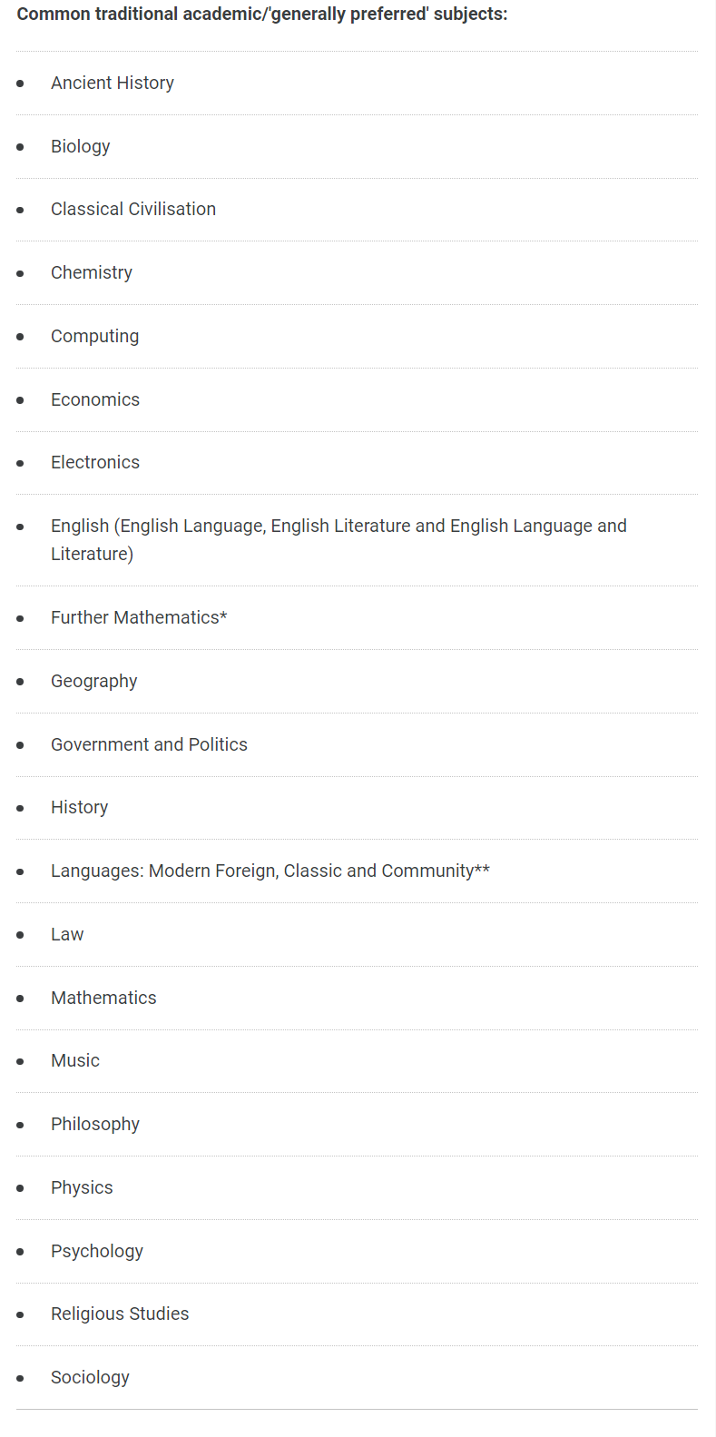 LSE也公布了自己的“偏爱学科”和“不偏爱学科”名单,他们要求申请者三门A-Level中的至少两门都来自传统科目。通常情况下,申请人会提供三到四个科目。