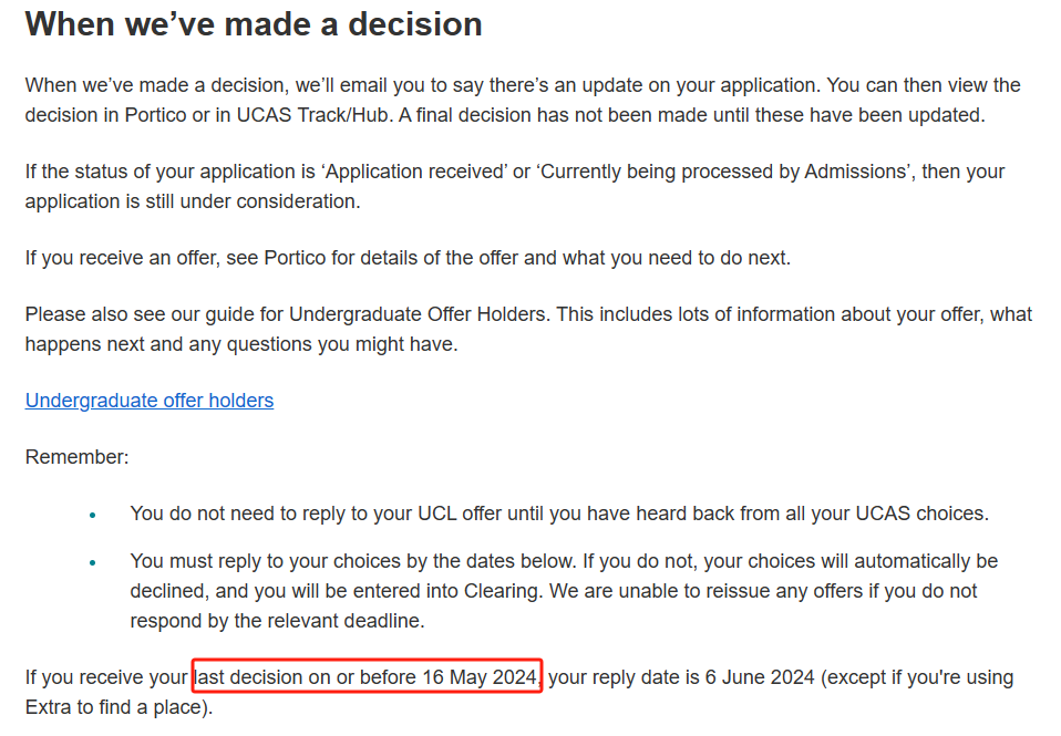 UCL表示2024年1月31日之前提交的申请,都将在2024 年5月16日之前给出申请结果。