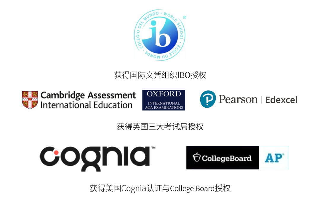 圣华紫竹学院是IB世界学校的一员,DP课程获得了国际文凭组织IBO授权(授权号061320);A Level课程获得英国三大考试局授权,包括剑桥大学国际考试委员会CAIE授权(授权号CN741)、牛津AQA本土及国际授权(授权号96046)和培生Edexcel授权(授权号94323);AP课程则获得Cognia认证和美国大学理事会College Board授权(授权号694738)。同时,学院获得美国非营利性教育考试研究机构ACT Inc.授权,正式成为ACT官方授权考点。