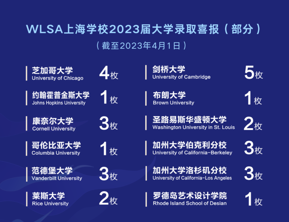 截止到4月20日,WLSA上海学校2023届美国方向毕业生收获US News综合排名前30大学的比例为55%;US News前50大学的比例约92%;QS/Times世界前30大学的录取比例为100%;英国综合大学方面G5录取比例为100%。